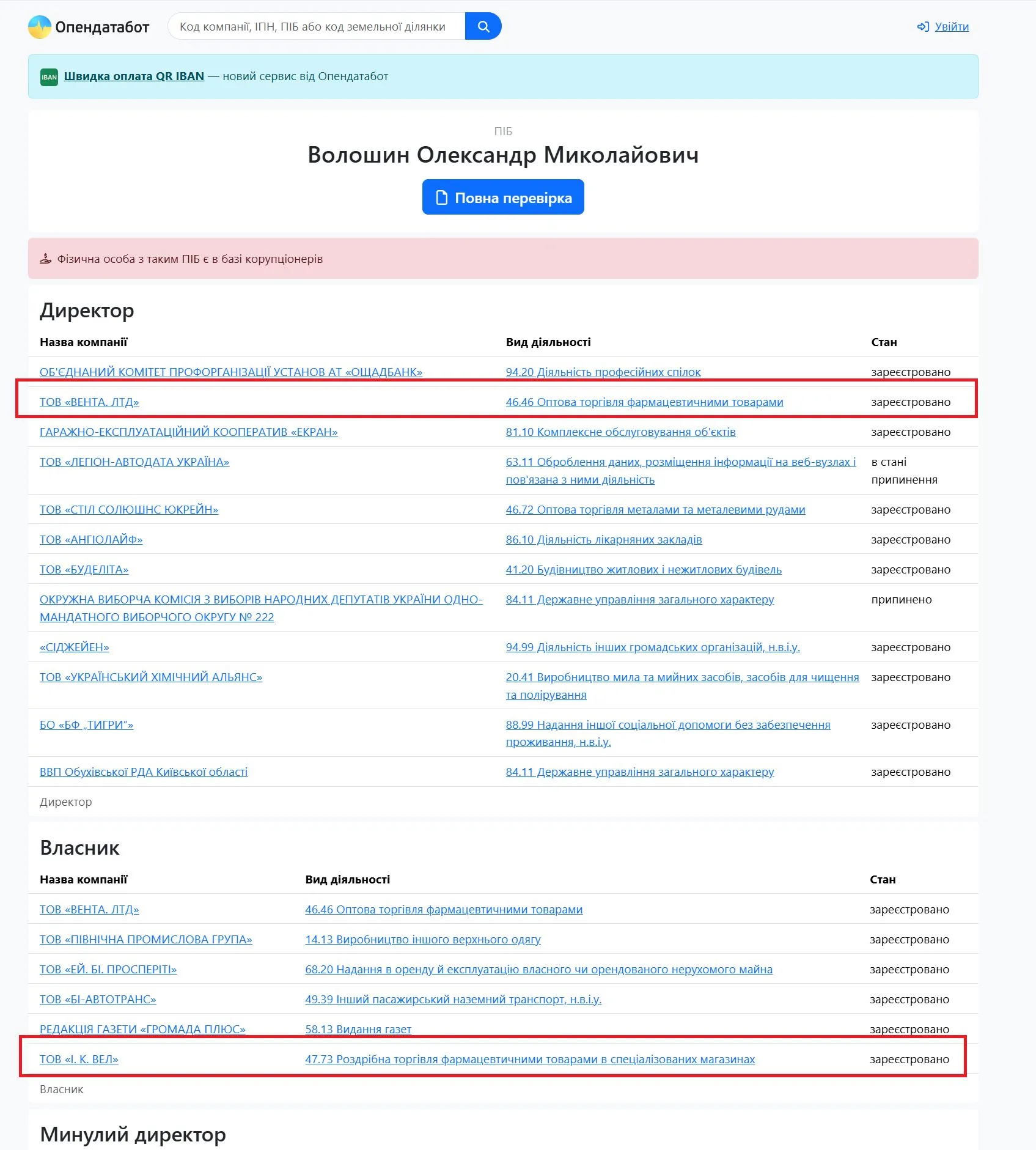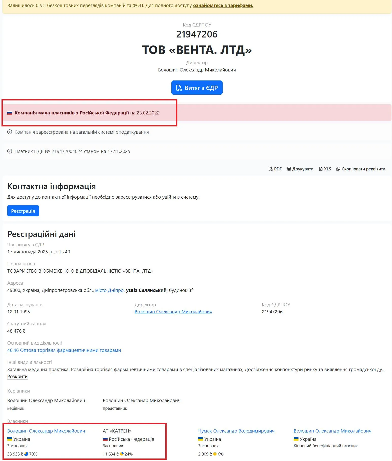 Російська корпорація «Катрен» до 2014 року контролювала 90% акцій українського дистриб'ютора медикаментів «Вента ЛТД».