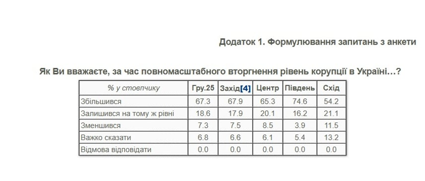 Згідно з результатами, 67% українців вважають, що корупція зросла після початку повномасштабної війни, 20% переконані, що рівень корупції залишився на тому ж рівні, а 5% помітили його зниження. При цьому збільшилася кількість тих, кому важко відповісти на це питання.