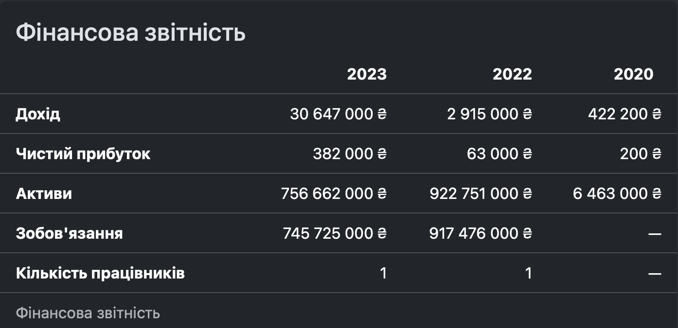 Статутний капітал компанії - 5 153 000 грн. З 2022 по 2023 рік дохід компанії зріс в понад 14 разів: