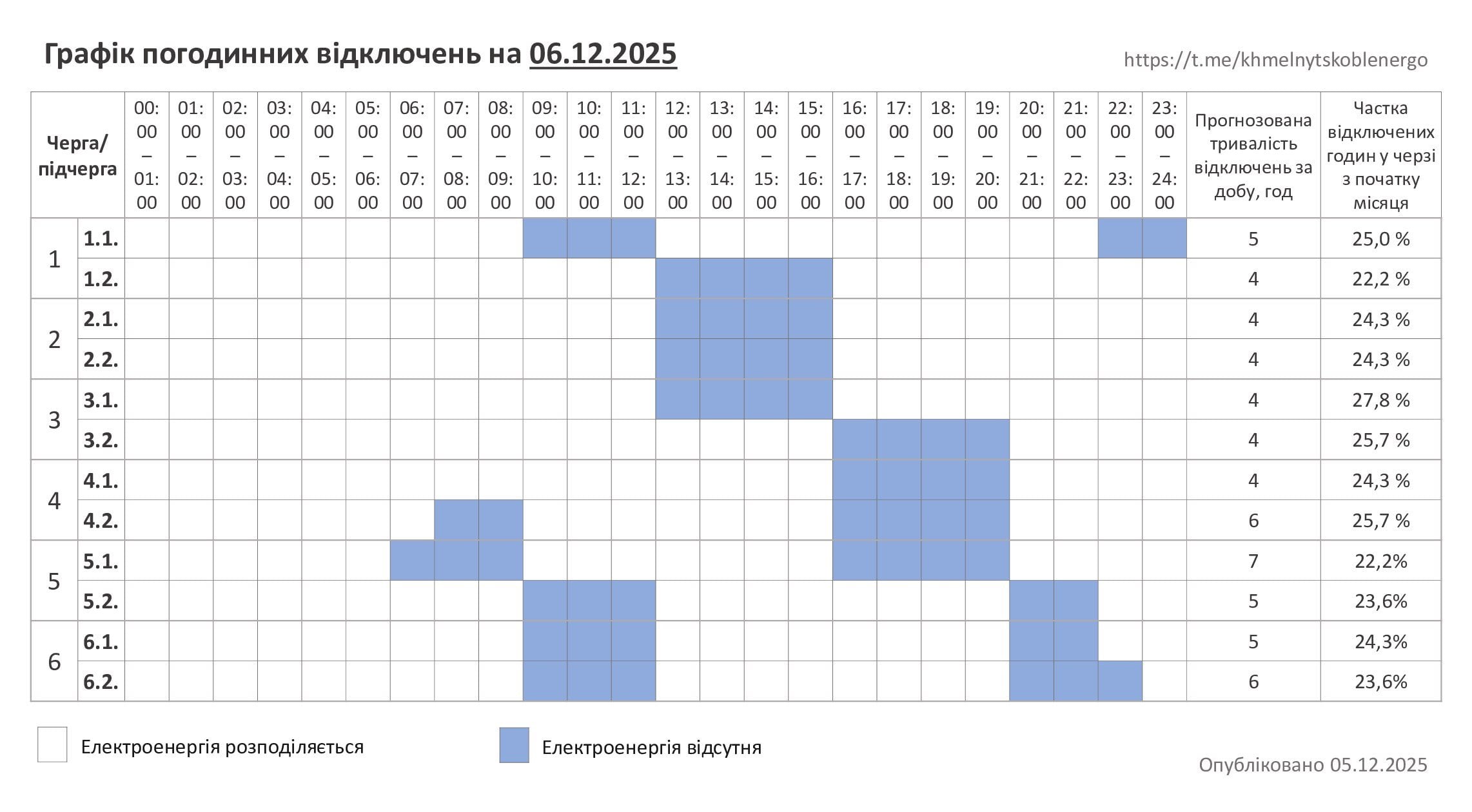 Графіки відключень на 6 грудня у Волинській області (інфографіка: energy.volyn.ua)