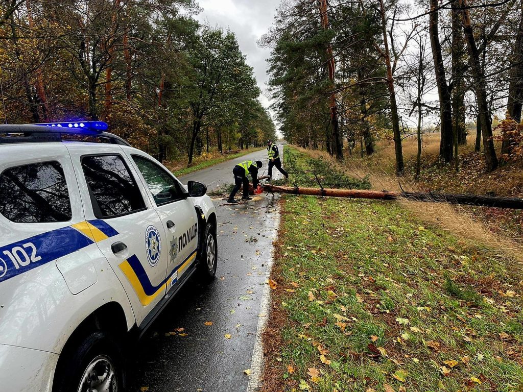 Київська міська військова адміністрація повідомила, що через повалені дерева на вулиці Вехній Вал в напрямку Набережно-Хрещатицької рух транспорту перекрито, а на вулиці Олени Теліги в напрямку метро "Шулявська" рух транспорту ускладнено.