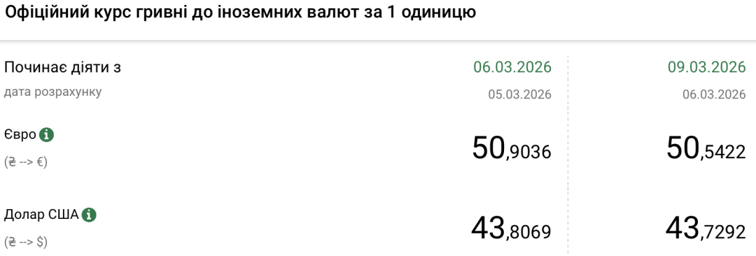 - 1 євро – 50,54 грн (50,90 грн станом на 6 березня).