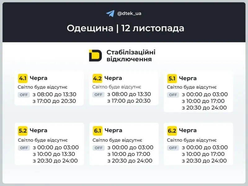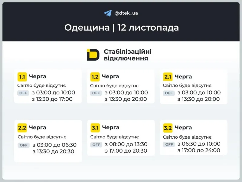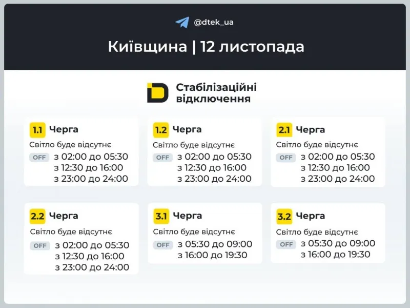 Графіки відключень електроенергії у середу 12 листопада