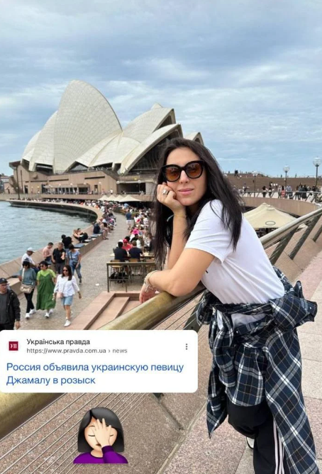 Вона опублікувала задумливе фото із Сіднею на тлі Сіднейського оперного театру, заголовком зі ЗМІ про оголошення її в розшук та відповідним емоджі. За даними росЗМІ її звинувачують у «фейках проти російської армії».