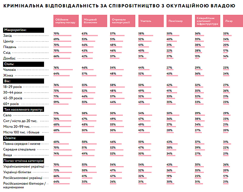 «69% респондентів вважають, що тих, хто працює в окупаційних адміністраціях, потрібно притягнути до кримінальної відповідальності. Коли йдеться про лікарів, то 66% проти притягнення їх до відповідальності. Щодо інших категорій ситуація менш однозначна», - йдеться у публікації.
