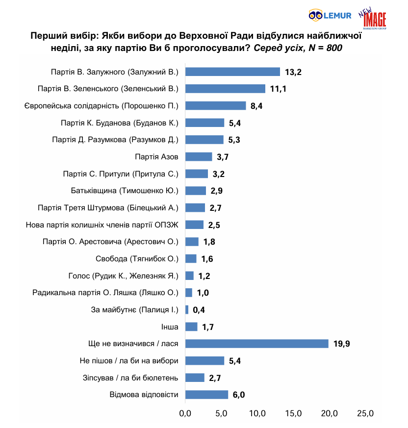 Так, партію ексголовкома, а нині посла у Великій Британії Валерія Залужного готові підтримати 13,2%.