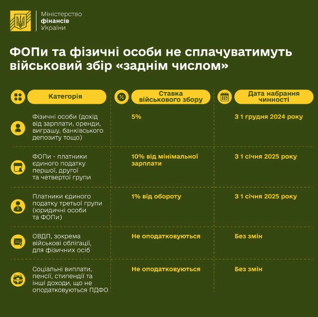 Фізичним особам не доведеться сплачувати військовий збір "заднім числом". Загальний річний дохід за 2024 рік буде обкладений військовим збором за ставкою 1,5%. З 1 грудня 2024 року доходи від операцій з майном, а також доходи у вигляді вартості успадкованого чи отриманого в дарунок майна оподатковуватимуться за ставкою 5%.