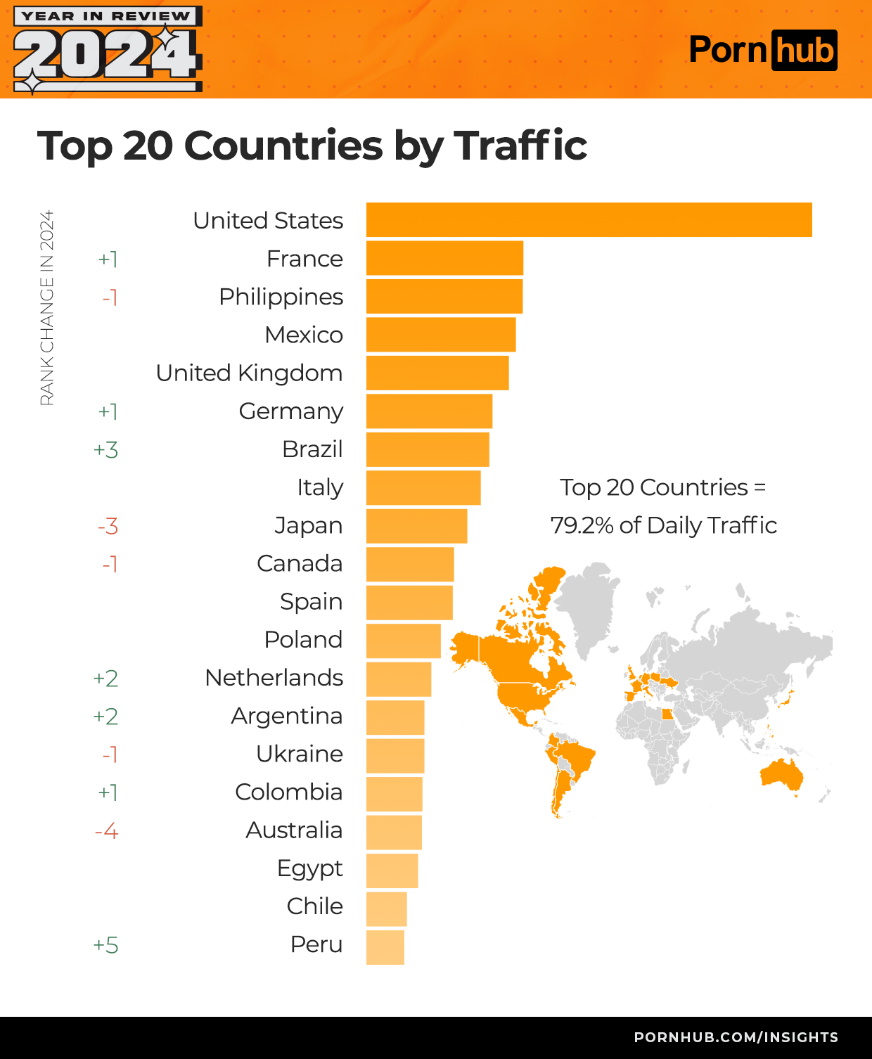 Порносайт Pornhub підбив підсумки 2024 року. Сайт назвав головні тренди світу й окремо по країнах, популярні запити і статистику переглядів.