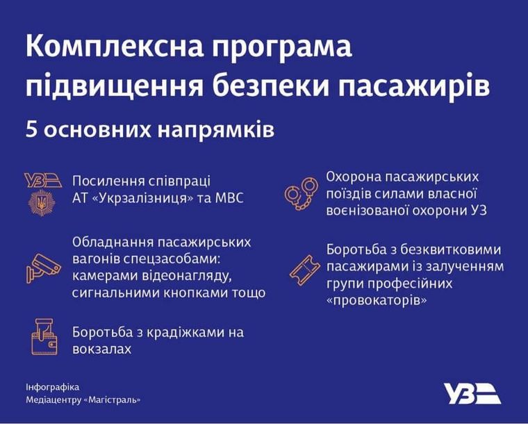 Укрзалізниця хоче підвищити безпеку в потягах, зокрема створити воєнізовану охорону. Про покращення безпеки заговорили після того, як вночі 31 серпня чоловік без квитка їхав у потязі «Маріуполь — Київ» та побив і намагався зґвалтувати пасажирку.