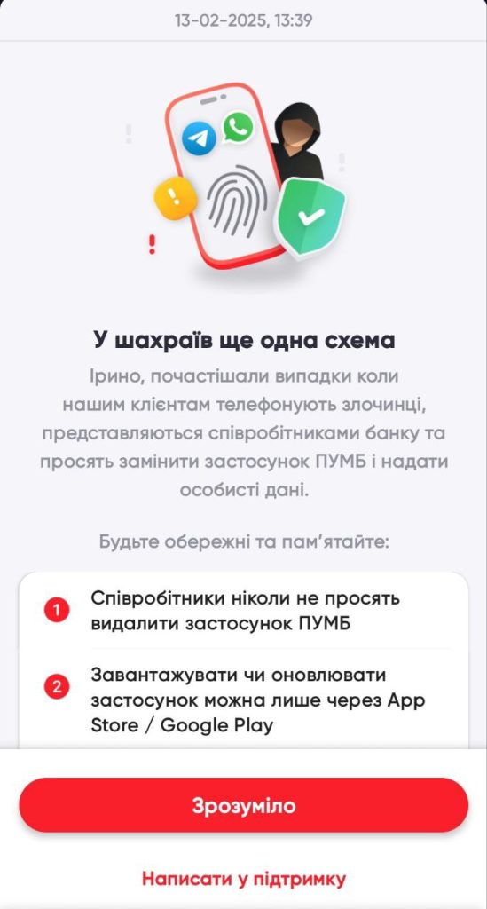 Зазначається, що злочинці телефонують клієнтам фінансової установи від імені співробітників ПУМБу, та пропонують замінити застосунок. Також просять надати особисті дані.