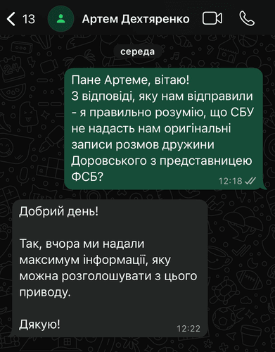 Служба безпеки України відмовилася надати журналістам hromadske оригінальні відео, на яких нібито співробітниця ФСБ погрожує дружині генерала СБУ Віктора Доровського. Також у спецслужбі не пояснили, у якому процесуальному статусі перебуває ця людина. Журналісти заявляють, що отримали лише ту інформацію, яка вже була оприлюднена в медіа.