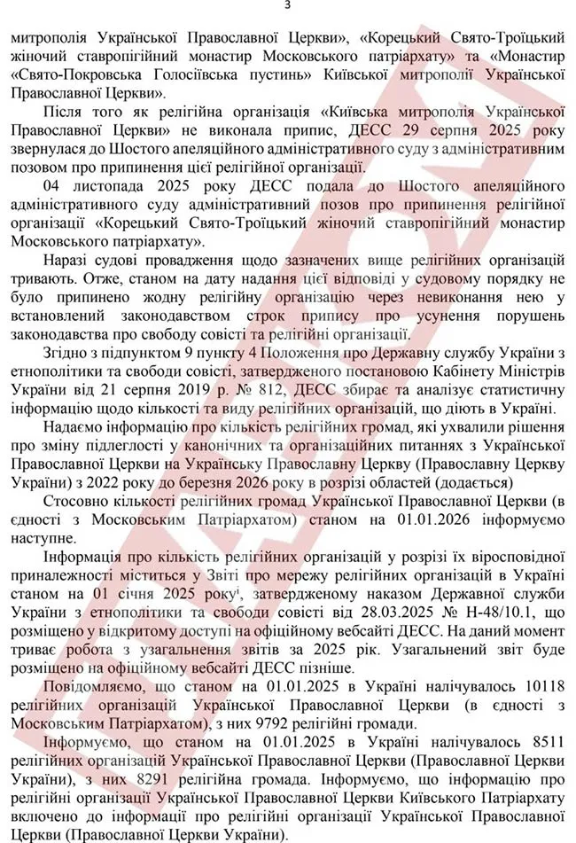 Державна служба України з етнополітики та свободи совісті (ДЕСС) розпочала судові процеси щодо припинення діяльності релігійних організацій, які ігнорують вимоги закону про розрив зв’язків із РПЦ.