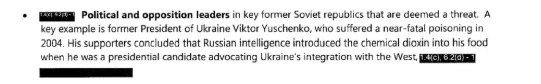У документі є згадка і про отруєння на той момент кандидата у президенти Віктора Ющенка у 2003 році – в розділі про політичних лідерів у країнах, які здобули незалежність після розпаду СРСР і яких Кремль вважав загрозою для себе. Водночас у записці подають припущення про причетність російських спецслужб не як припущення західної розвідувальної спільноти, а як "висновок його прихильників".