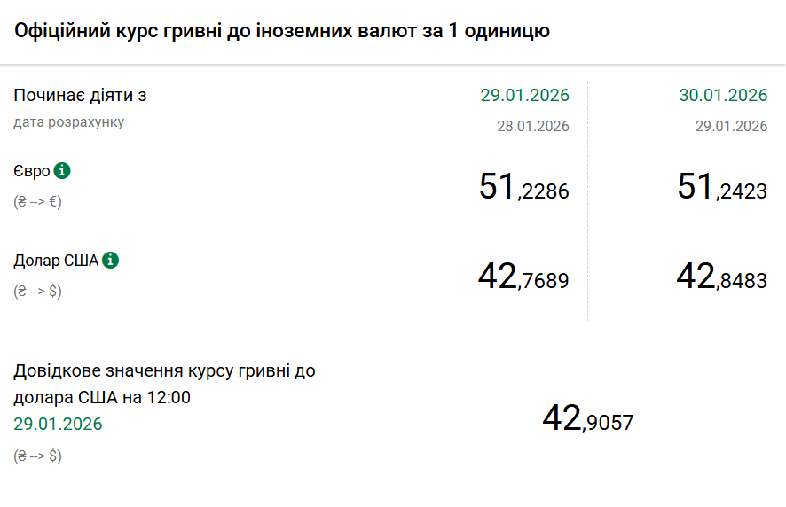 - 1 долар США – 42,84 грн (42,76 грн станом на 29 січня);