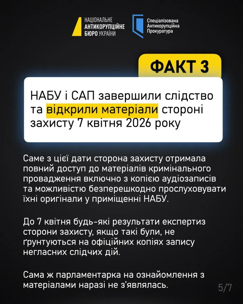 НАБУ і САП Завершили слідство у справі пропозиції хабаря нардепам з боку лідерки БЮТ Юлії Тимошенко та відкрили матеріали для ознайомлення стороні захисту перед судом. Сама ж парламентарка на ознайомлення так і не з'явилася.
