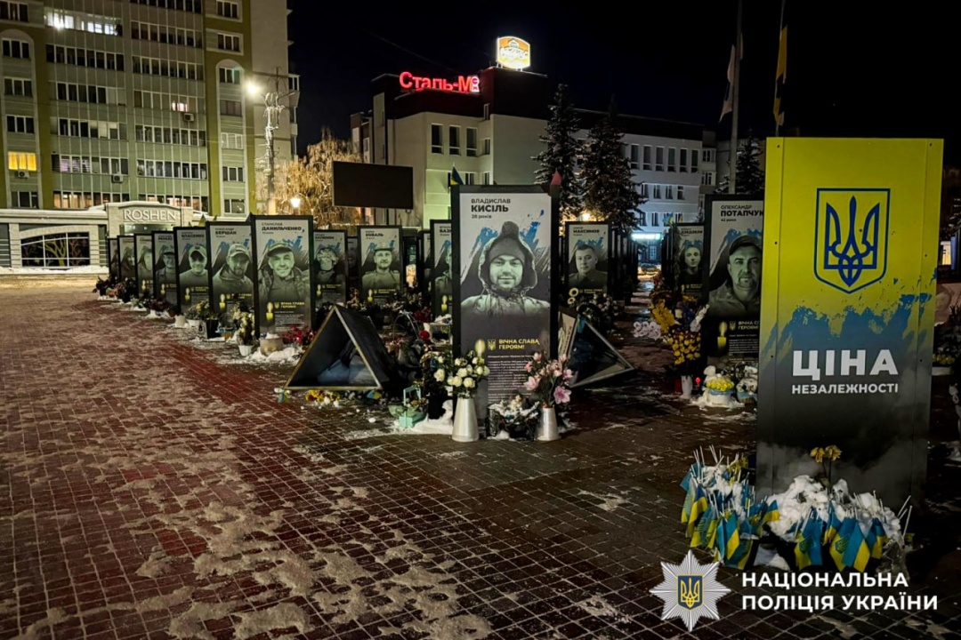 За даними відомства, пізно ввечері 16 січня 41-річна жінка у стані алкогольного спʼяніння перекинула 13 металевих конструкцій з портретами загиблих Героїв, які були встановлені у центрі Рівного.