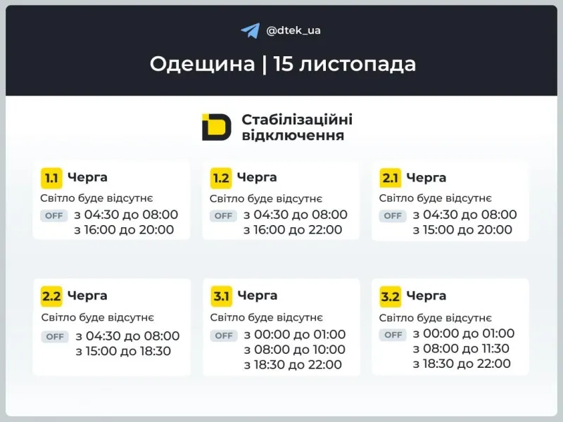 Відповідно до команди НЕК "Укренерго", з метою стабілізації ситуації в енергосистемі, 15 листопада по Запорізькій області будуть застосовані графіки погодинних відключень (ГПВ).