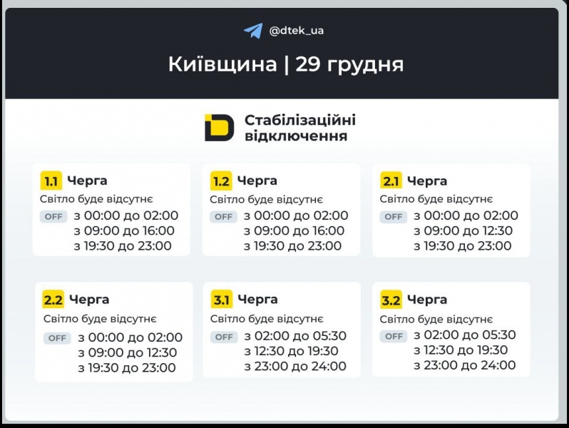 Через наслідки ворожих обстрілів і складні погодні умови 29 грудня в Україні застосовують погодинні та аварійні відключення електроенергії. Також діють обмеження потужності для бізнесу й промислових споживачів.