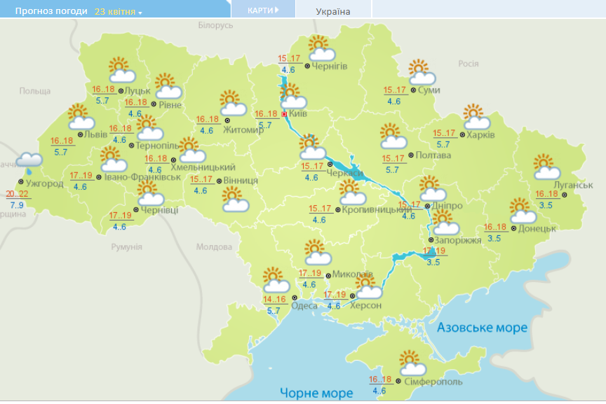 На 22 число прогнозують заморозки 0-3° (ІІ рівень небезпечності, помаранчевий). 23 квітня у більшості областей теж замерзе поверхня ґрунту 0-3° (I рівень небезпечності, жовтий).