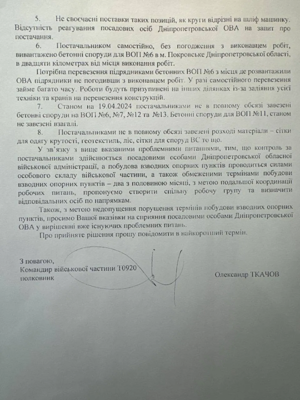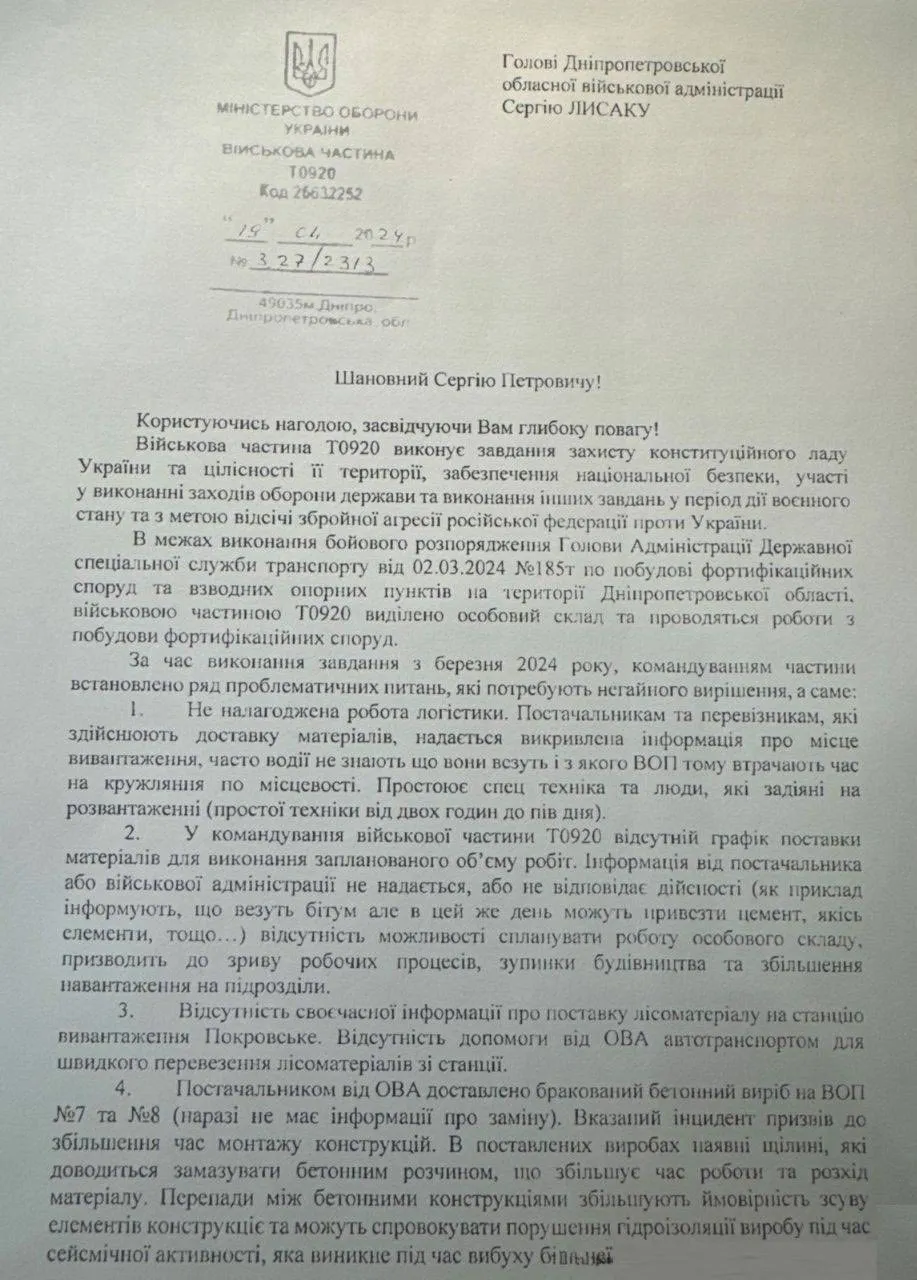Ще у 2024 році військова частина Т0920 офіційно зверталася до очільника області з попередженням про критичні проблеми. Військові наголошували: логістика зірвана, бетон неякісний, а процес будівництва — хаотичний.