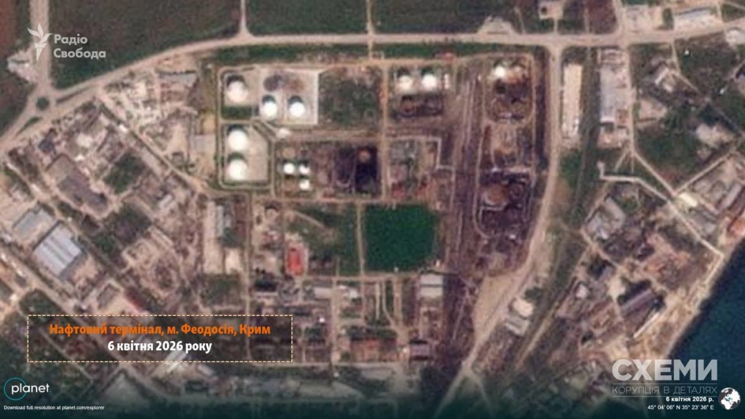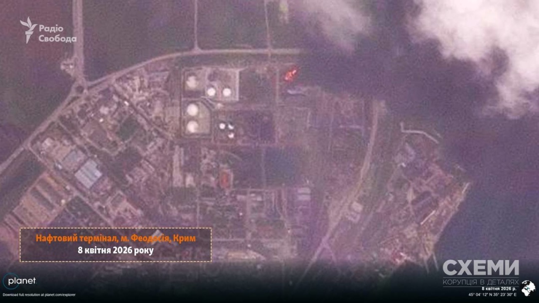 На знімках компанії Planet Labs за 8 квітня, які є у розпорядженні журналістів "Схем" (Радіо Свобода), видно пожежу та клуби диму на території ключової нафтобази окупованого Росією Криму– "Морський нафтовий термінал" у Феодосії.