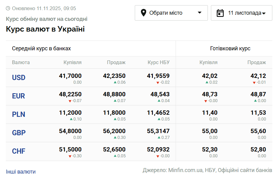 monobank — 41,78–42,18 грн/$ та 48,30–49,00 грн/€.