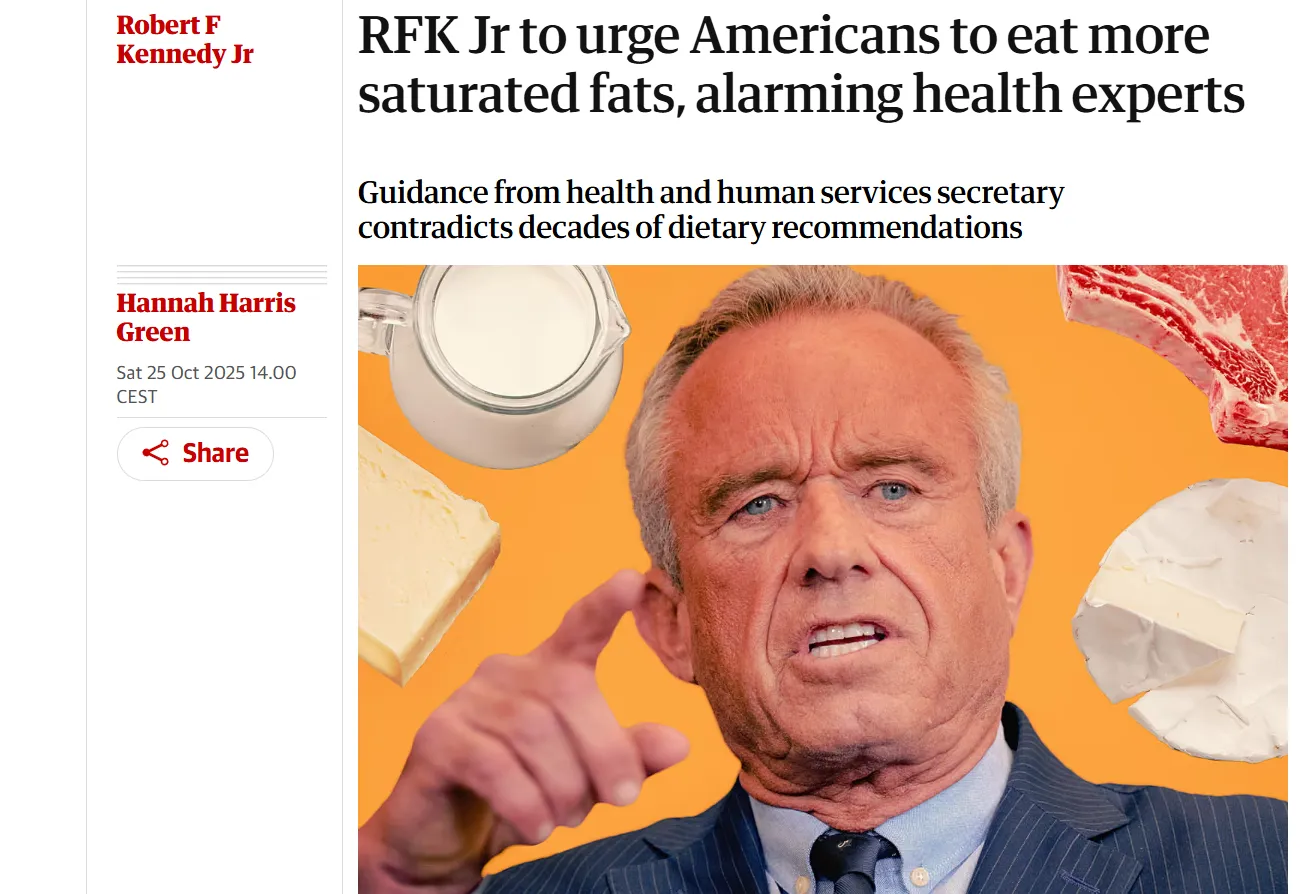 Роберт Ф. Кеннеді-молодший звинувачує сучасні настанови у «брехні» та вважає, що споживання насичених жирів з молочних продуктів, якісного м’яса і овочів є важливим для здоров’я.