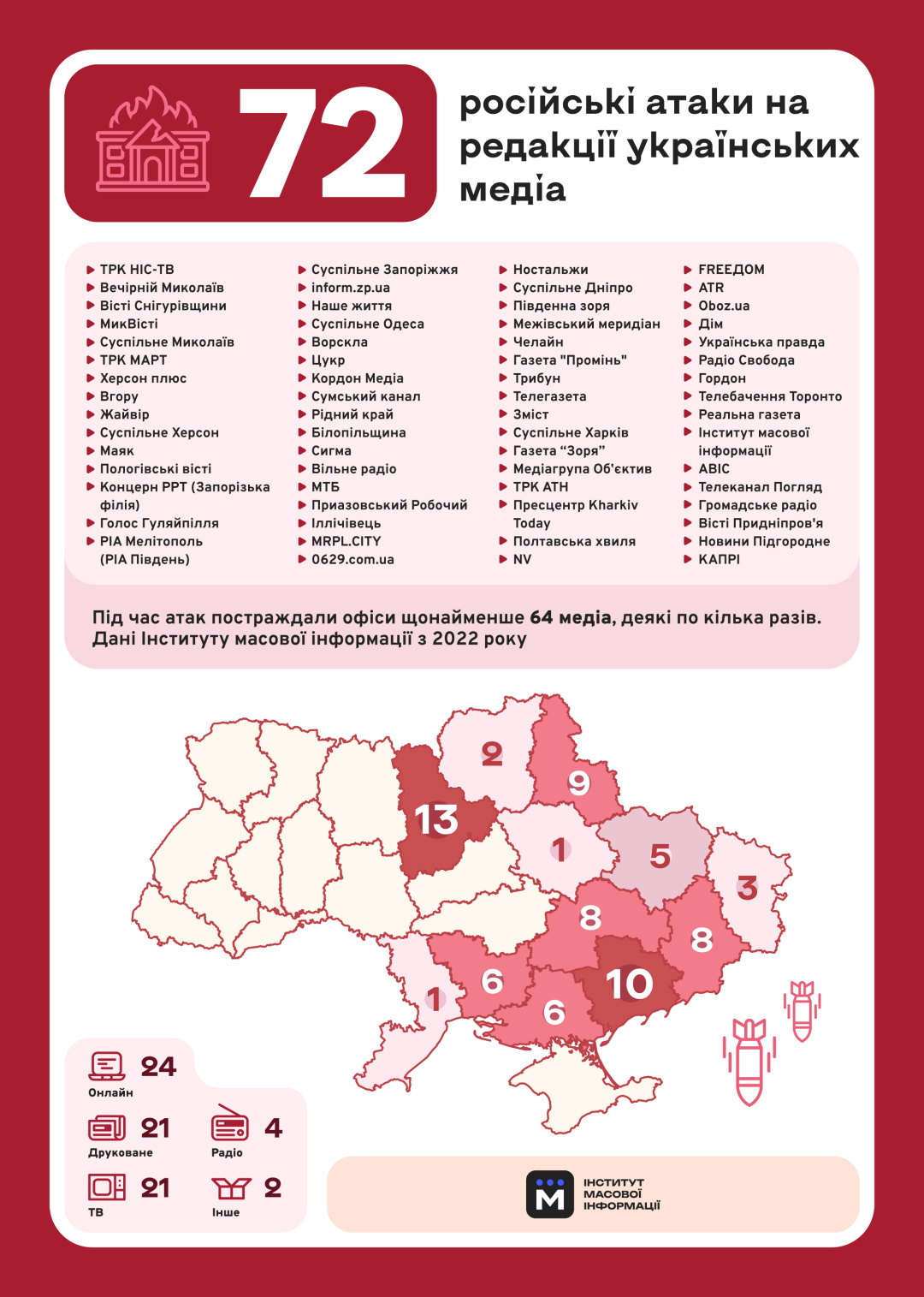 За даними Інституту масової інформації, від початку повномасштабного вторгнення Росія щонайменше 72 рази завдавала ударів по редакціях українських медіа. Унаслідок атак частина з них була пошкоджена або повністю зруйнована.
