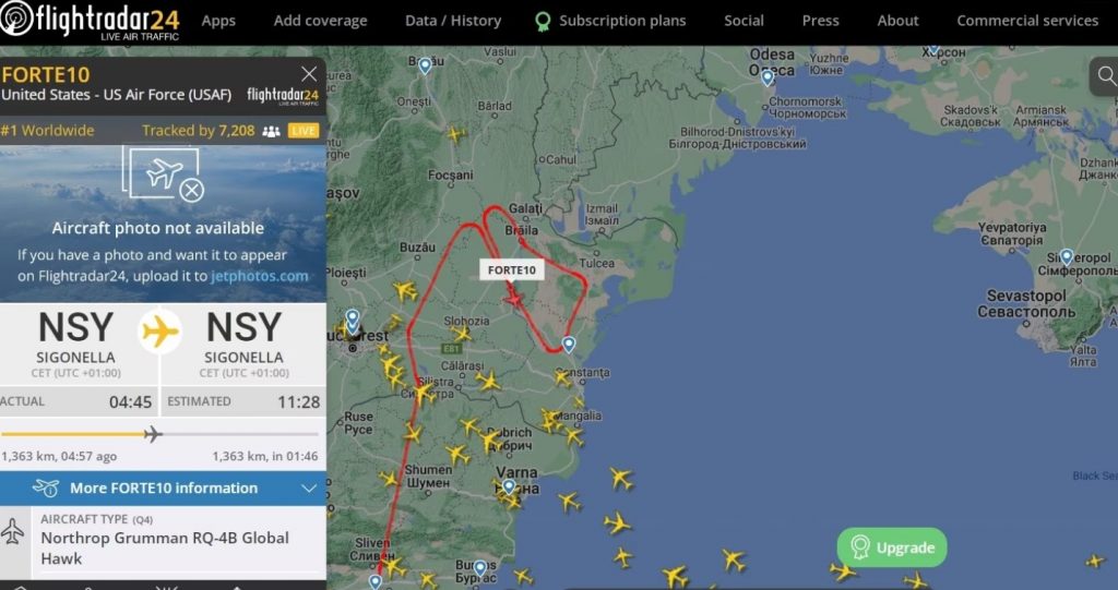 За даними сервісу, дрон RQ-4 Global Hawk із позивним FORTE10 прямував до Чорного моря, проте до акваторії так і не зайшов.