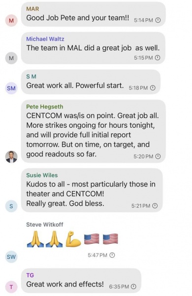 Згідно зі скріншотами, які показало видання The Atlantic, лише за півгодини до початку американської операції 15 березня в секретному чаті топ-чиновників США в Signal, куди помилково додали Голдберга, розпочалася переписка. Глава Пентагону Піт Гегсет написав про детальні плани американців, які стосувалися вильоту винищувачів F-18, вильоту дронів MQ-9, а також застосування ракет Tomahawk.