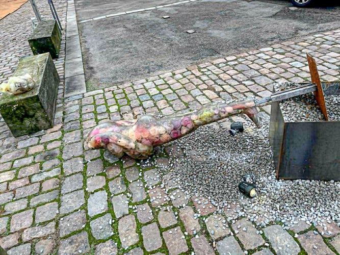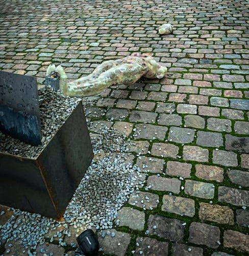 Серед зруйнованих об’єктів — дві фігури вагітних жінок та меморіальна скульптура з квітів. Саме ці роботи були центральними для виставки, адже говорили про життя, яке народжується навіть у стані війни, і про тіло як простір пам’яті та болю.