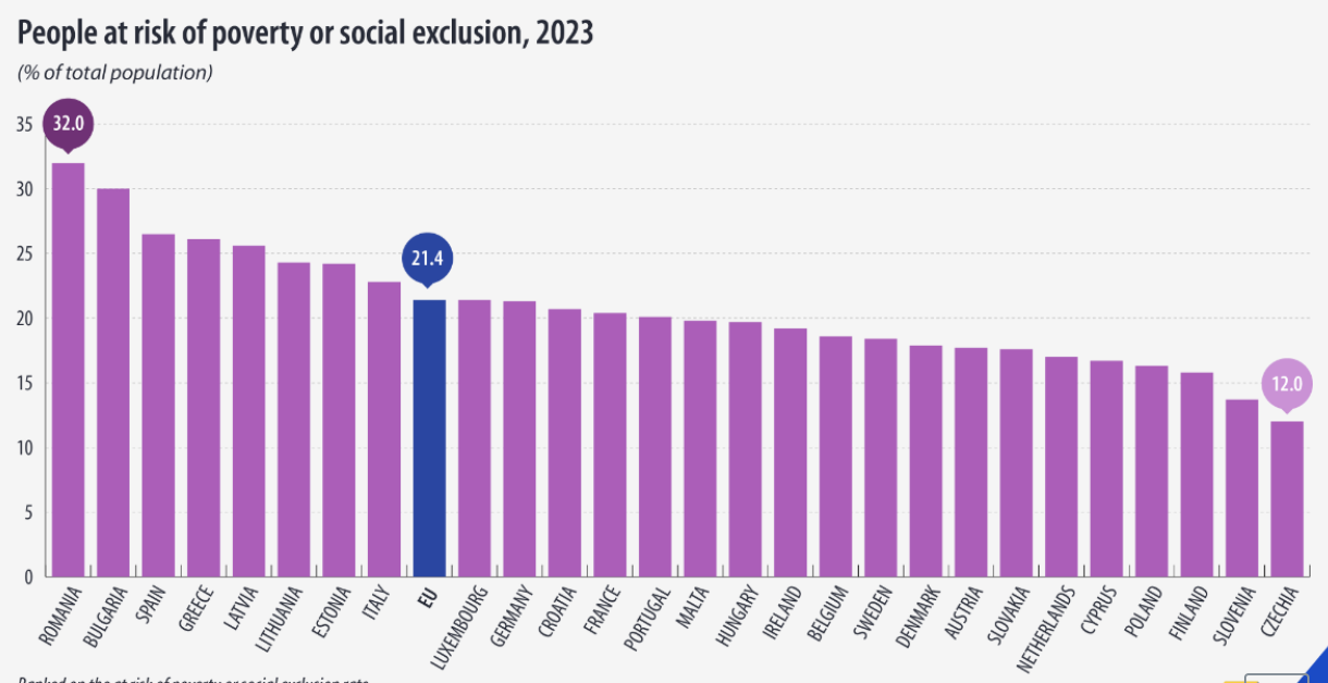 У Європейському Союзі 94,6 мільйона осіб (21% населення) перебували під загрозою бідності чи соціальної ізоляції у 2023 році. Про це свідчать дані Євростату.