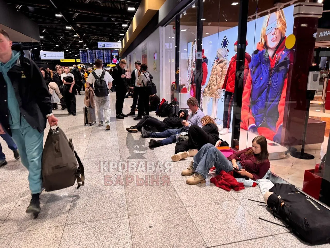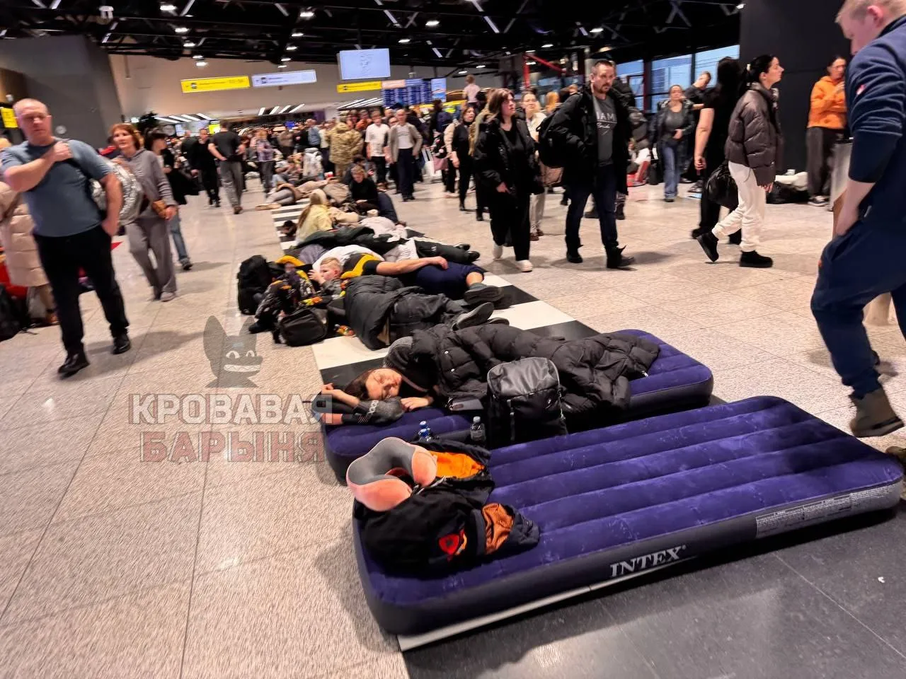 У зоні прибуття зібралися тисячі пасажирів, які годинами не могли отримати свій багаж. Люди влаштувалися на підлозі, в кафе та магазинах у пошуках затишку.